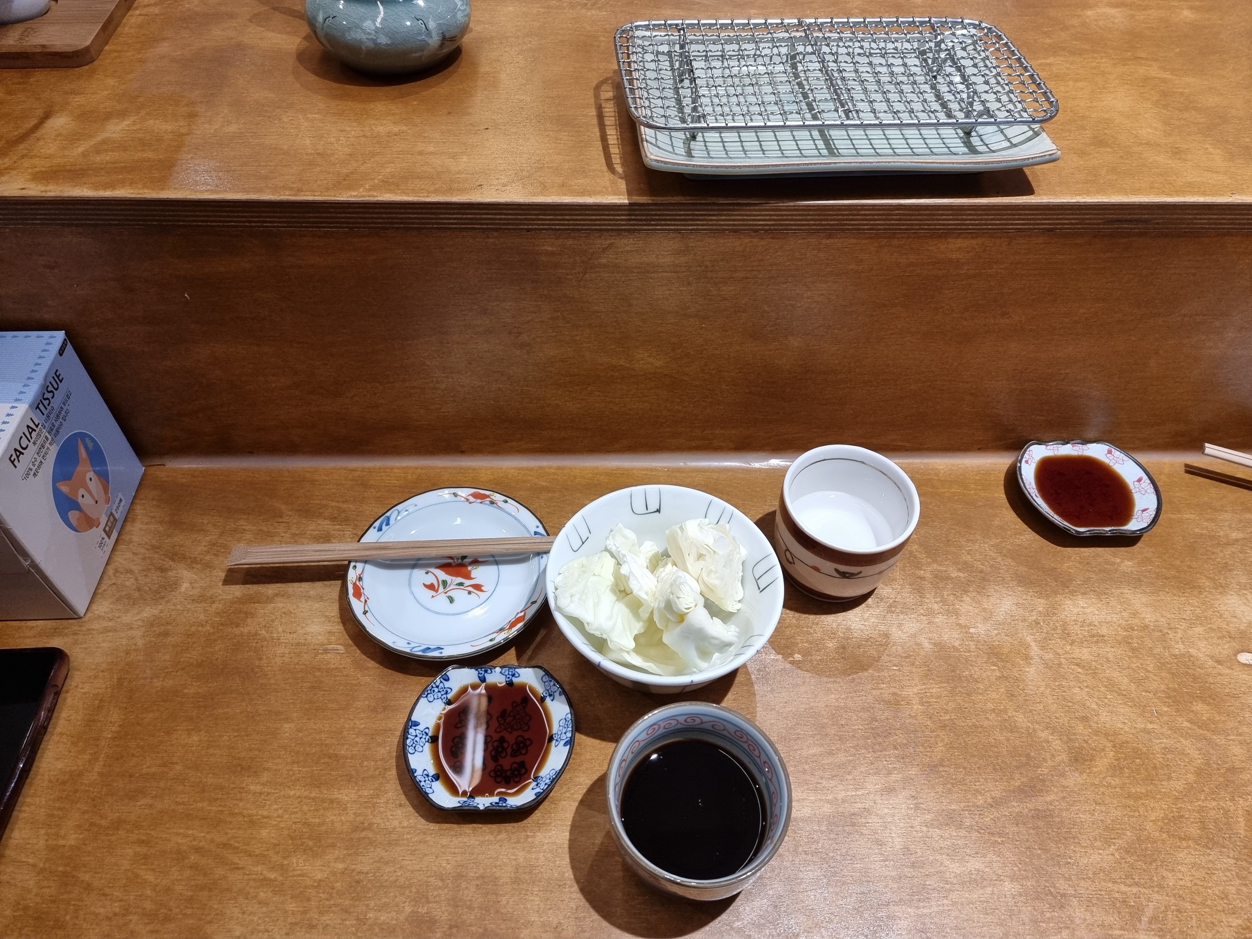 양배추, 쿠시아게 소스, 오뎅 간장, 오뎅국물, 앞접시입니다